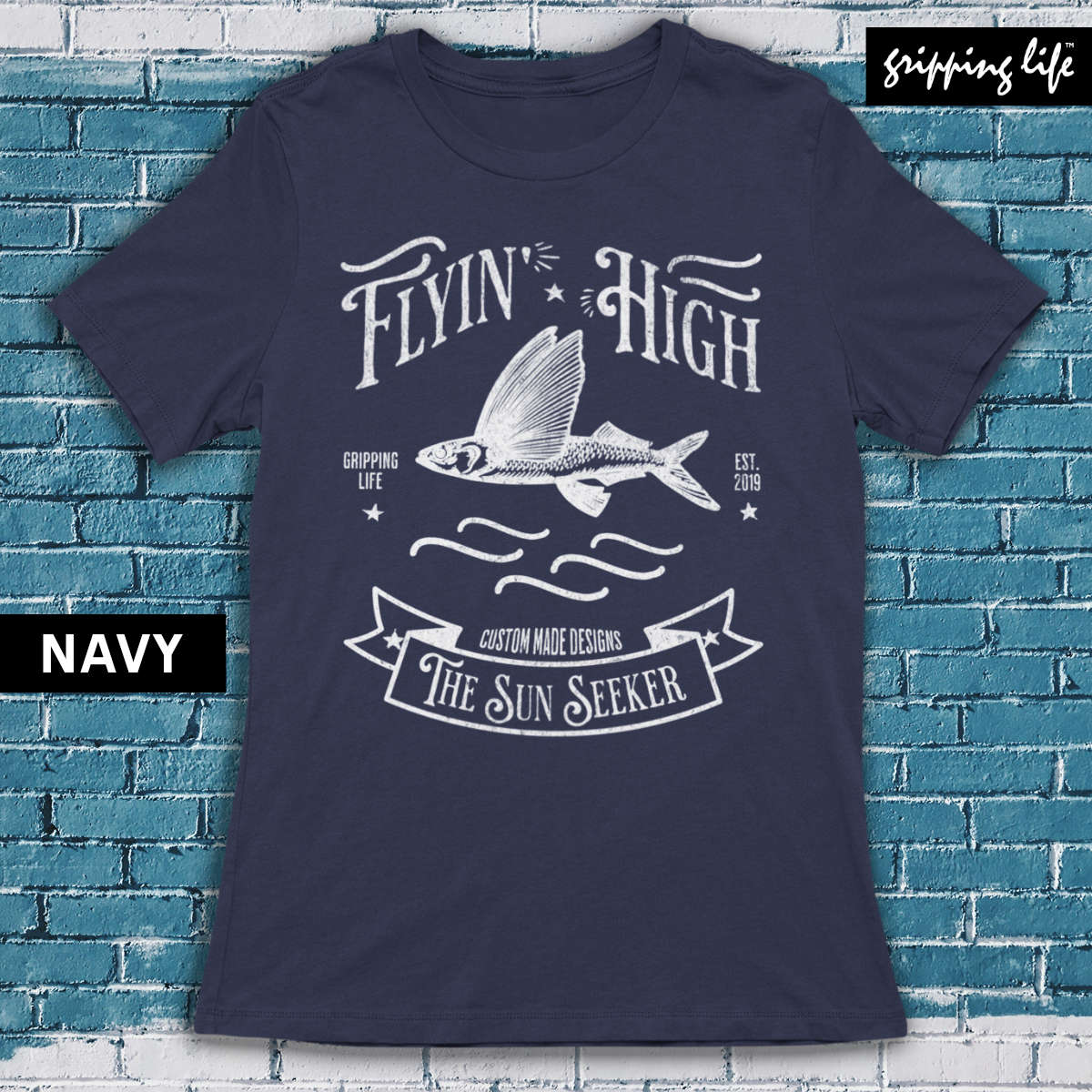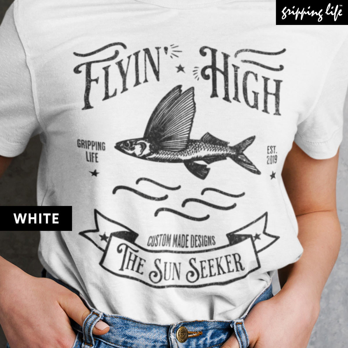 Soar to new heights of style with this minimalist masterpiece, the ” The Sun Seeker” T-shirt! This minimalist marvel features a wavy, one-color design of a majestic flying fish gliding over the open water. It’s the perfect blend of simplicity and whimsy, guaranteed to have everyone asking, “How did you get your shirt to do that?” Whether you’re lounging at home or making a splash in public, this T-shirt will elevate your look and make you feel lighter than air. Embrace your inner ichthyological aviator and get yourself a Flyin’ High T-shirt today!
